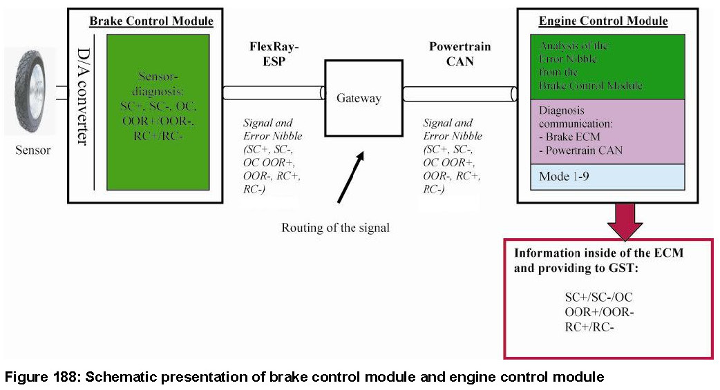 The vehicle speed signal faults detected by the ESP/ABS control module are transmitted to the ECM via the FlexRay/CAN bus by means of an OBD error nibble (= half-byte = 4 bits) which contains the fault information of each wheel speed sensor. Obtaining the fault information, the ECM forwards it to its fault memory. A fault code is only registered in the ECM if none of the wheel speed sensors provides the ESP/ABS control module with a valid signal, and thus the MIL is commanded on if none of the wheel speed sensors is fault-free.