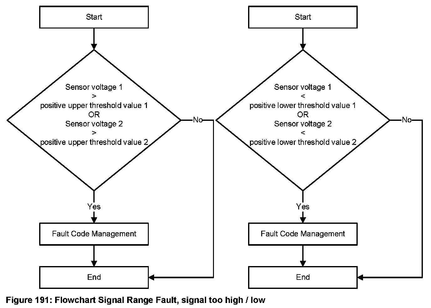 The sensor voltage 1 is compared to a positive upper / lower threshold value 1, and the sensor voltage 2 is compared to a positive upper / lower threshold value 2. If one of the two sensor voltages exceeds its upper threshold value, this sensor is detected as faulty (voltage too high). If one of the two sensor voltage is lower than its lower threshold value, this sensor is detected as faulty (voltage too low). The corresponding fault is registered in the fault memory. If both sensor voltages exceed their upper threshold values or are lower than their lower thresholds, both sensors are detected as faulty and the corresponding faults are registered in the fault memory.