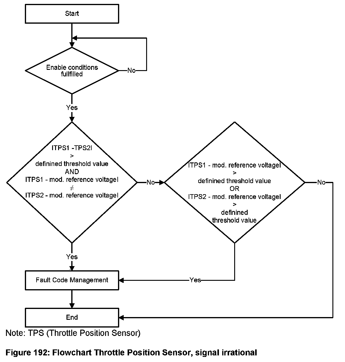 The engine control module calculates the required opening angle of the throttle from the accelerator pedal position and adjusts the throttle drive correspondingly. The throttle position is detected by two sensors (potentiometers). The voltages of the two sensors (potentiometers) vary depending on the throttle position and are transmitted to the engine control module separately. The fault detection for throttle position sensor 1 and throttle position sensor 2 are carried out similarly. The throttle plate, the throttle drive, and the throttle position sensors are integrated into one unit, called the throttle unit.