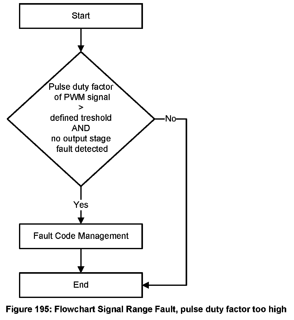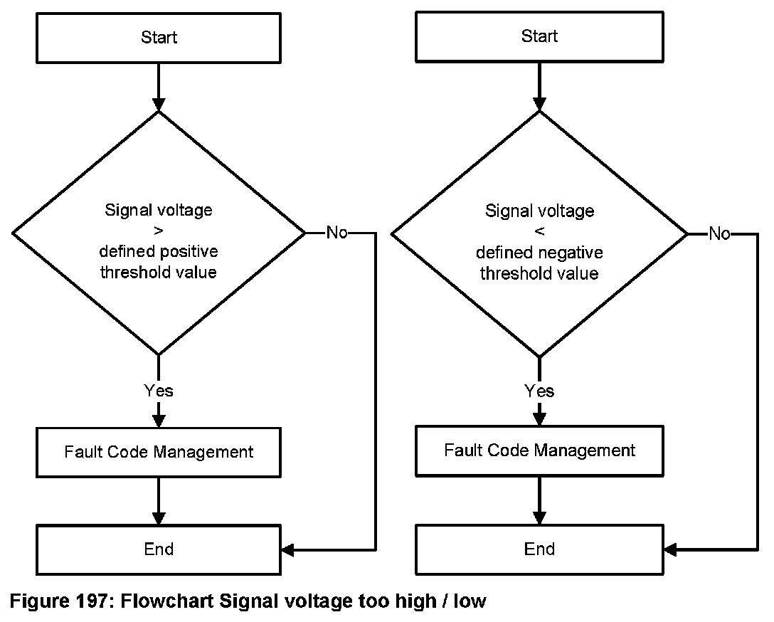 The signal voltage is compared to a positive threshold value. If the voltage exceeds this positive threshold value, a signal is detected which is too high and a fault is registered.