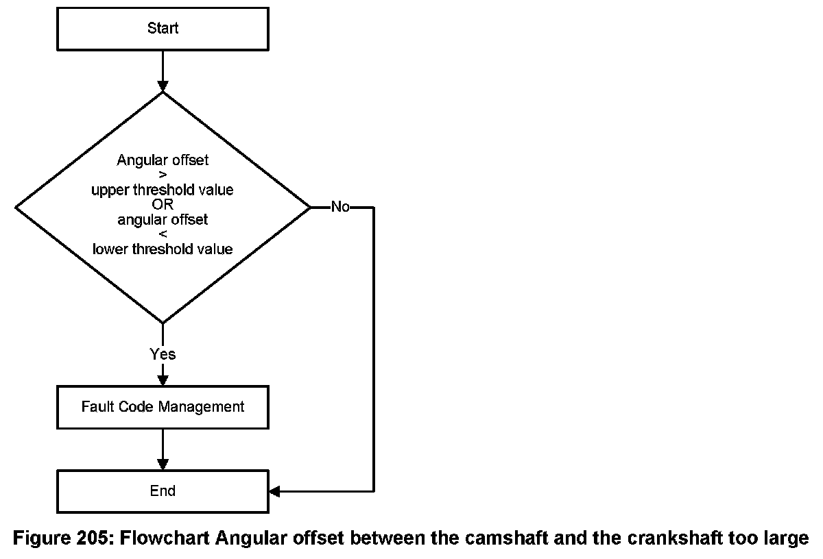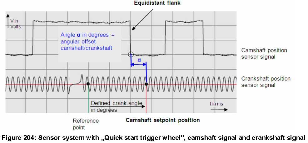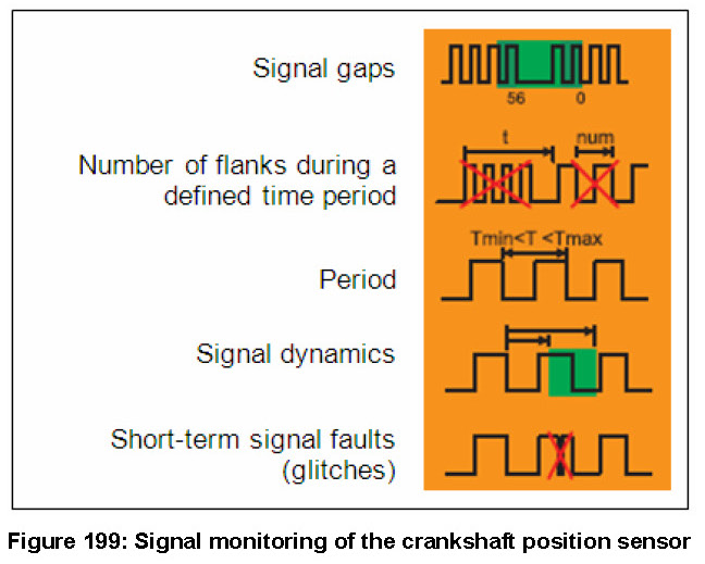 The signal flanks that are continuously detected by the camshaft position sensor and the crankshaft position sensor are sent to the ECM and stored in a buffer memory. Every 100 ms, the monitoring function evaluates the signal flanks detected since the last evaluation. The "available" camshaft signal flanks during these time segments must correspond to at least one complete camshaft revolution. If not enough signal flanks occur, the evaluation is interrupted until the next time segment is reached.