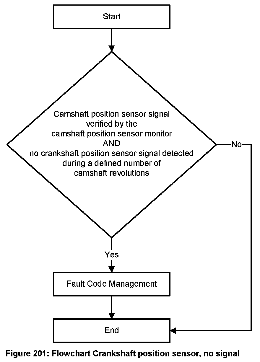 If the camshaft position sensor signal has been verified by the camshaft position sensor monitor AND no signal from the crankshaft position sensor has been received within a defined number of camshaft revolutions, a signal fault is detected and the corresponding fault is stored in the fault memory.