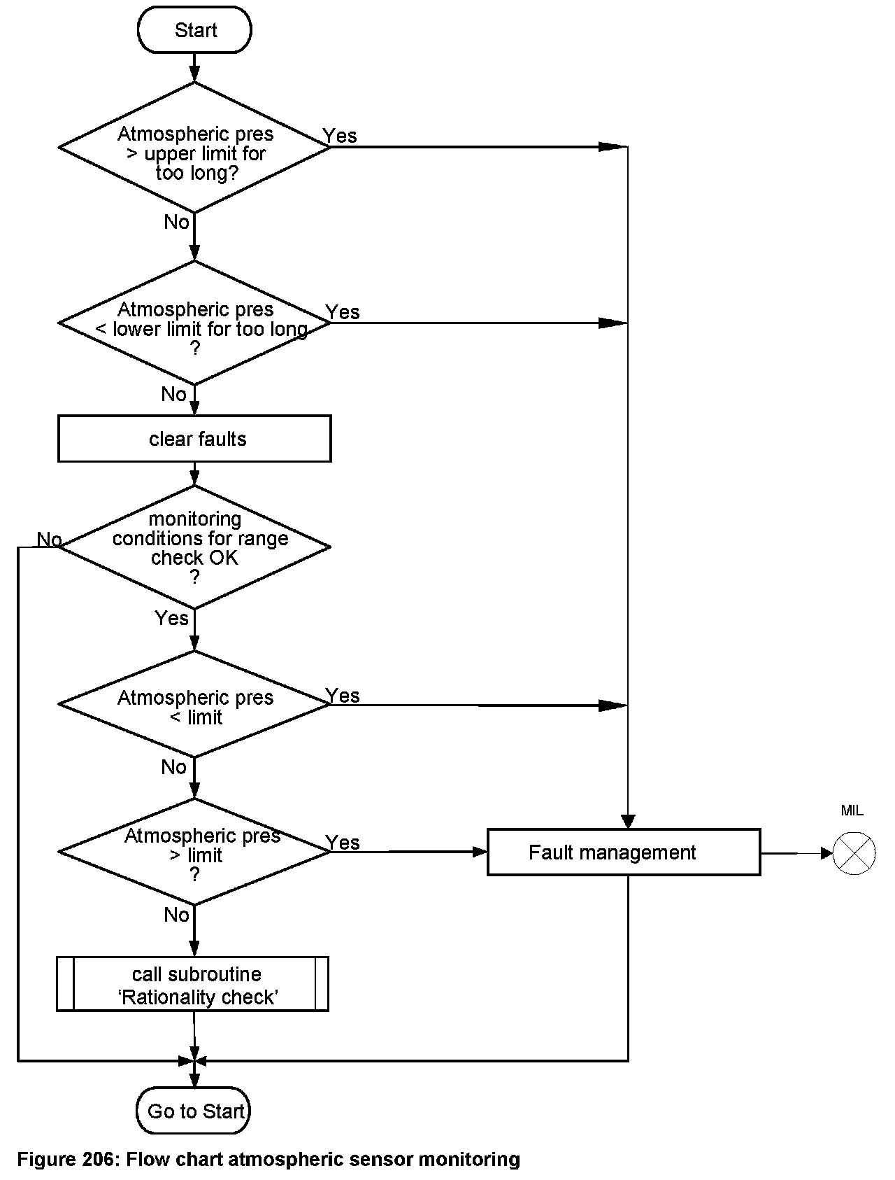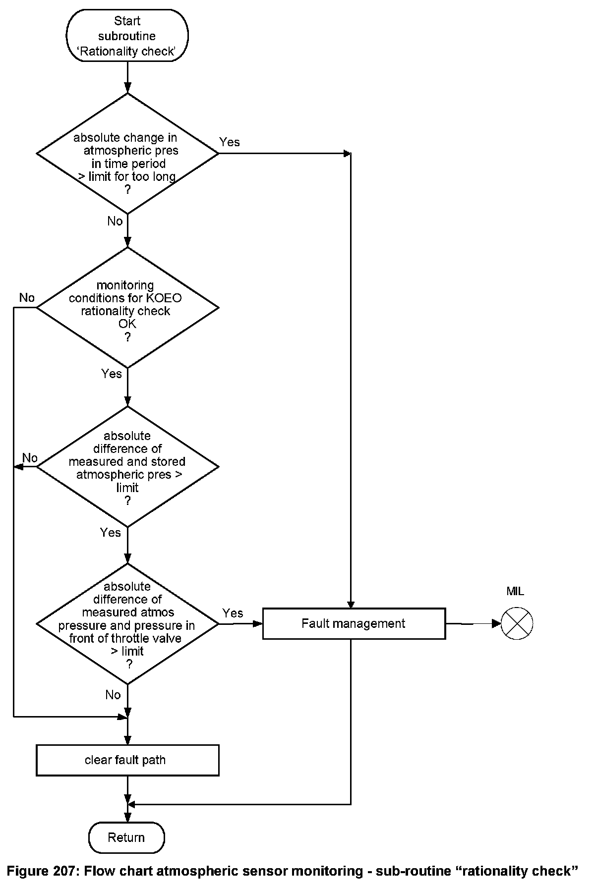 The KOEO check compares the atmospheric pressure at KOEO with the value stored at the last engine shut down. If this is not the same, and the atmospheric pressure is not similar to the upstream throttle pressure at KOEO, an Atmospheric Pressure Circuit Range/Performance fault is set.