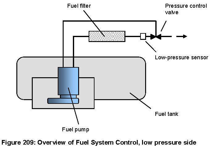 The low pressure system is the fuel delivery system to the high pressure system. In order to keep the delivery pressure in a certain range, the fuel pressure is controlled via fuel pressure sensor.