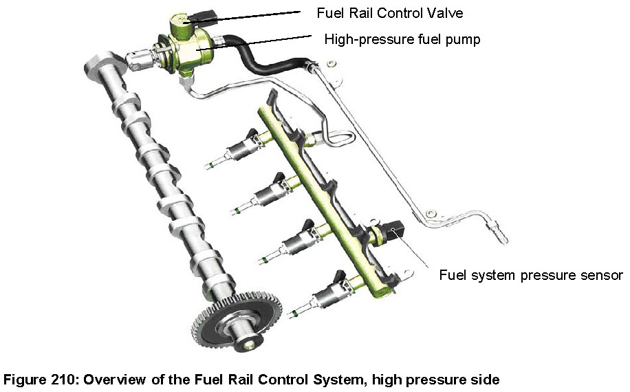 The fuel rail control valve is an electrically controlled valve within the high-pressure fuel pump. The valve is located between the fuel-supply line and the pump chamber and regulates the mass fuel flow, thereby setting the pressure in the fuel distributor rail.