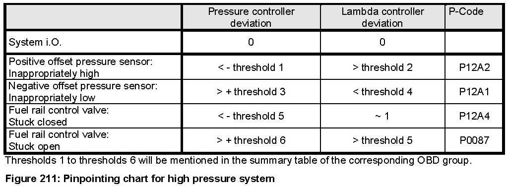 The pinpointing-strategy for the high pressure system is based on the fact that incorrect pressure information will cause Lambda deviations due to the pressure based calculation of the injection time. Incorrect pressure information can only be caused by positive or negative offset-faults of the high pressure sensor. However faults of the fuel rail control valve also influence the pressure control activity but they will be completely corrected (Lambda controller deviation ~0) through the calculation of the corresponding injection time.