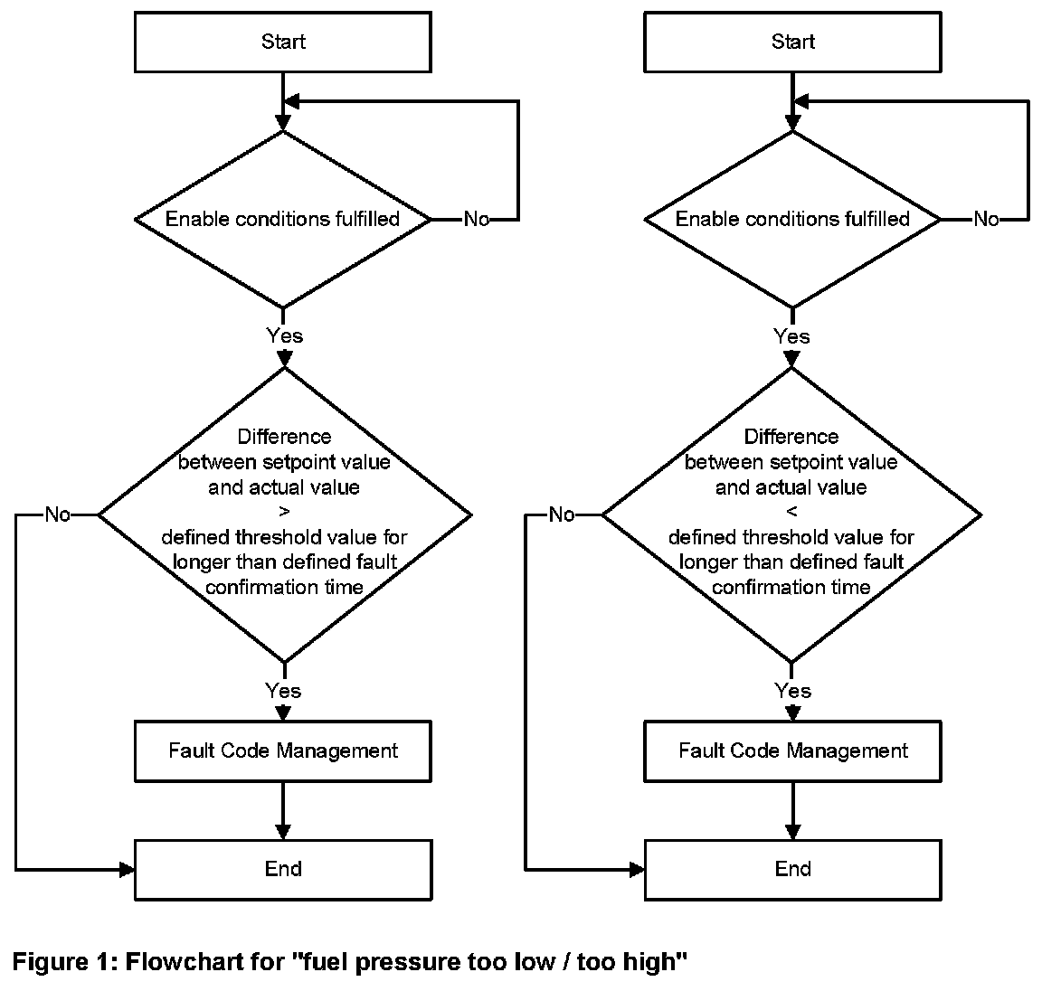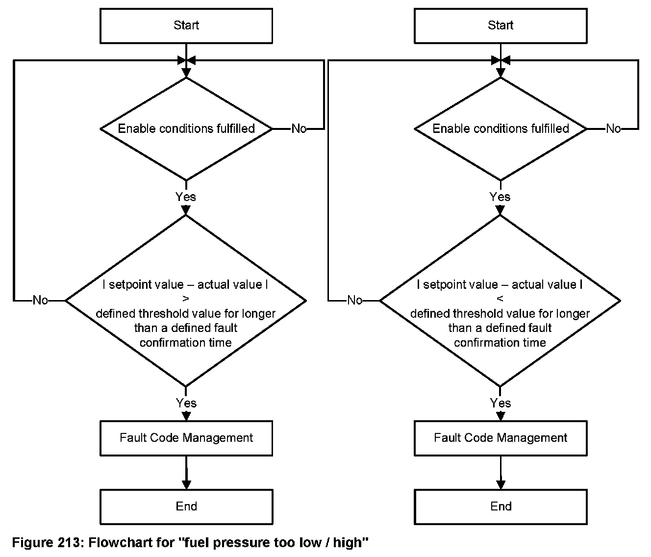 The fuel pressure measured in the low pressure system is compared to the value defined by the engine control module. The difference between the setpoint value and the actual value is evaluated.