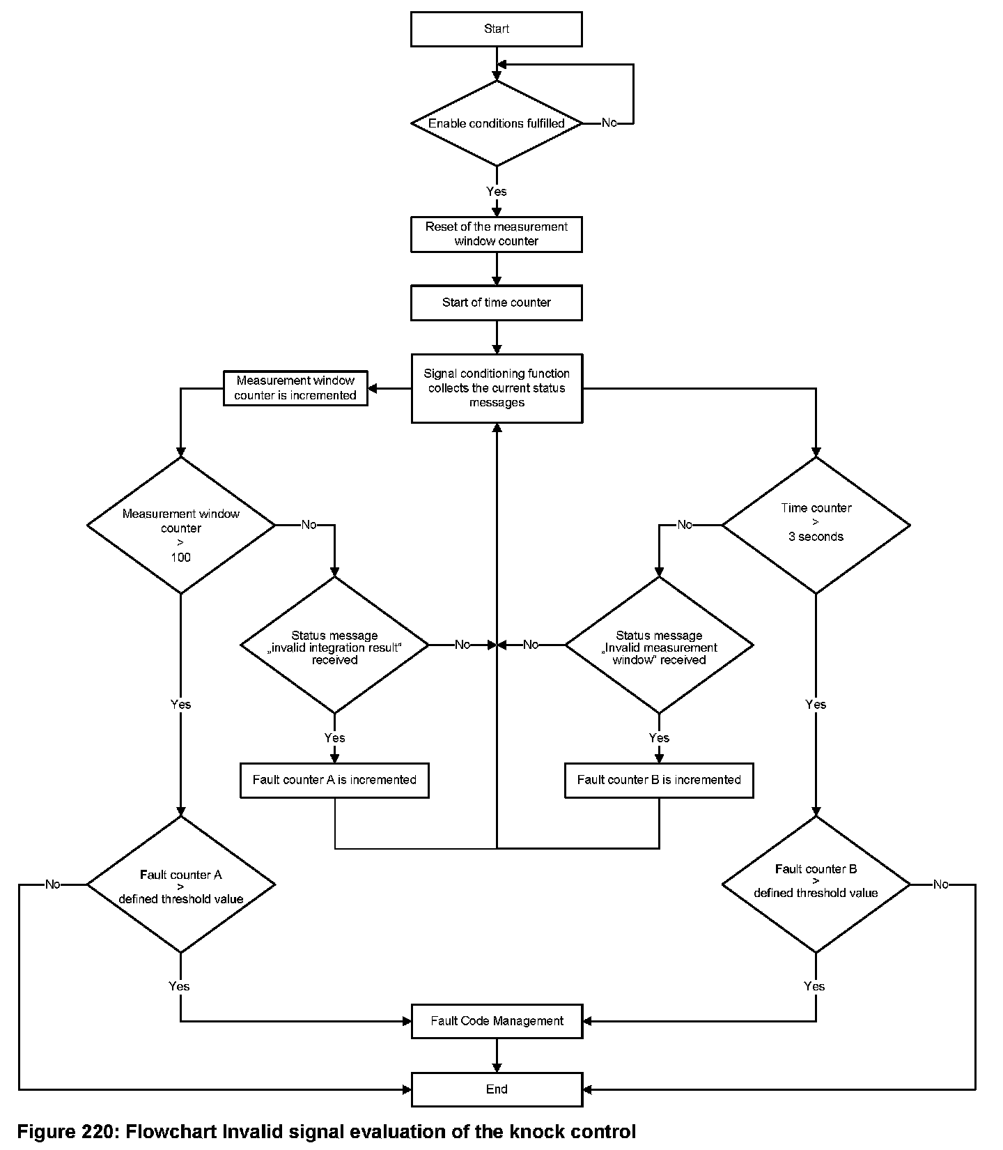 If the signal voltage of pin A or B of the knock sensor is less than a defined threshold value for a defined time period, a short to ground is detected and the corresponding fault is stored in the fault memory.