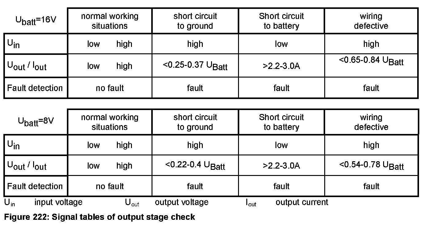 If the control line of one stage has a different signal than the output line, the logic circuit inside the IC detects a malfunction. The logic circuit within the IC can separate the type of fault to a short circuit to minus, an open line, or a short circuit to plus. The check result will be sent to the ECM via diagnosis line.