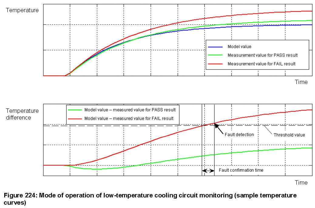 When the enable conditions are fulfilled, the monitor is started. On the basis of the temperature after the throttle, the engine coolant temperature and the pressure ratio (intake manifold absolute pressure / pressure after throttle), a modeled charge air temperature is determined. If the difference between the measured charge air temperature (mean value from the charge air temperatures of bank 1 and bank 2) and the modeled charge air temperature is greater than a threshold value, the fault "charge-air cooler, efficiency too low" is detected.
