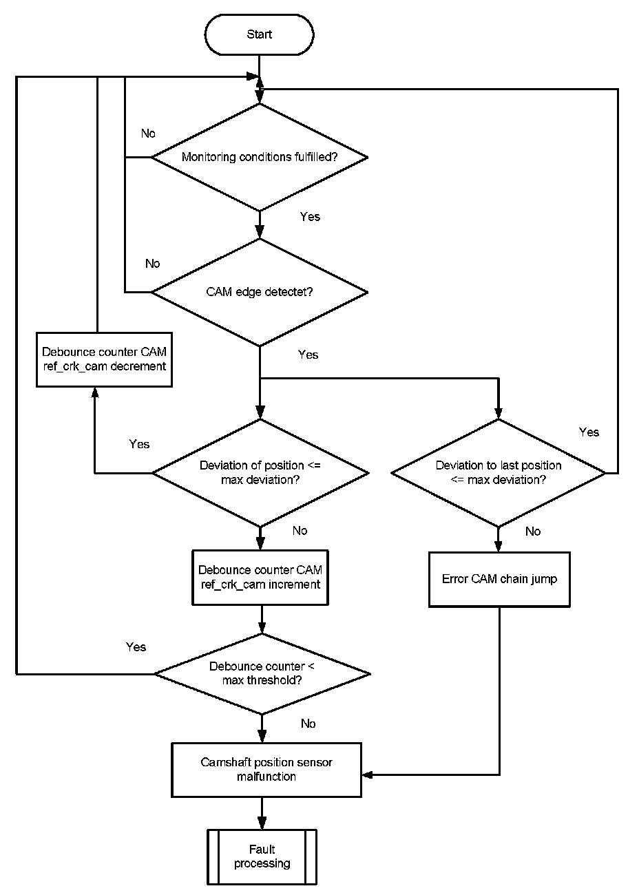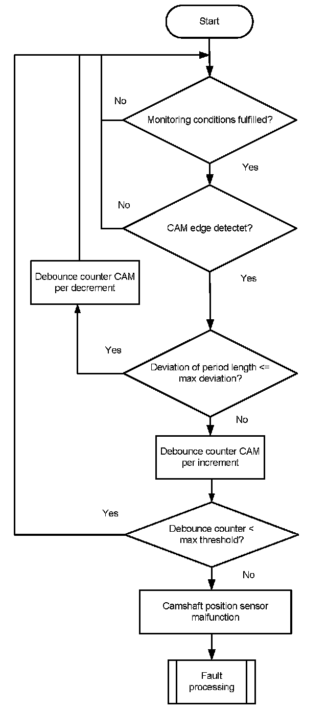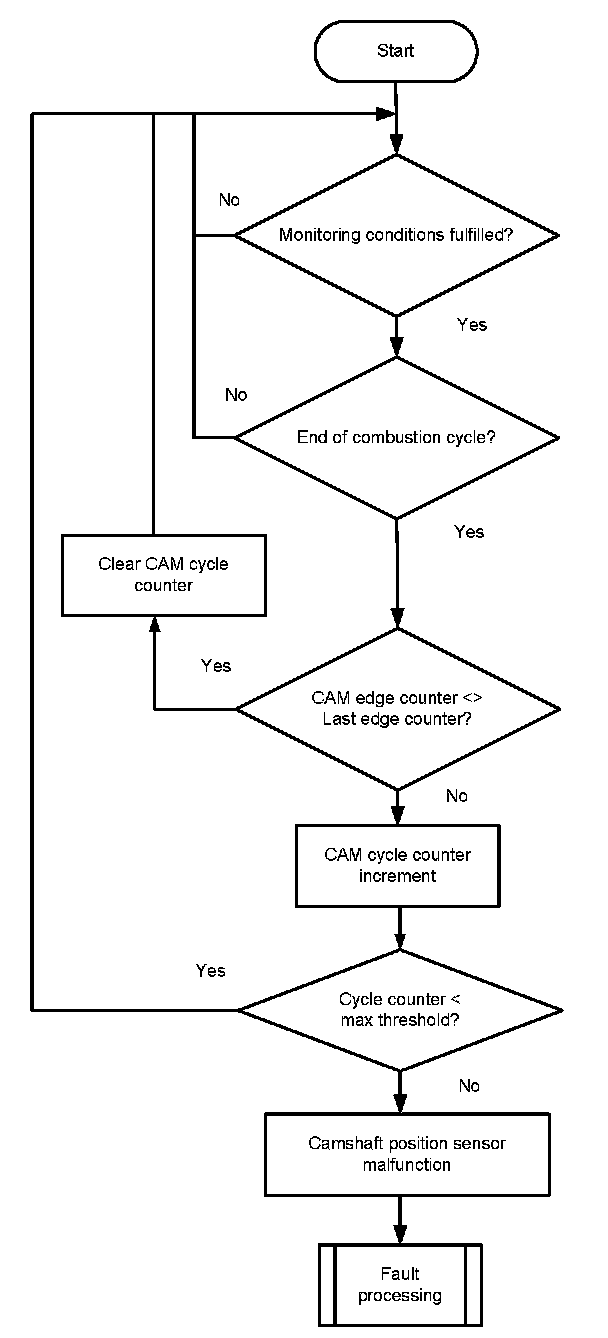 The monitor checks once per combustion cycle the edge counter of the camshaft. If the edge counter has not changed during the last cycle, a cycle counter is incremented. When the counter reaches a threshold, the error CAM plaus. is delivered to the error management.