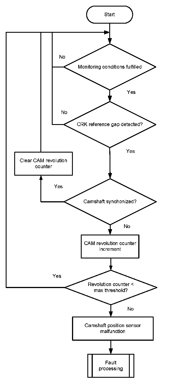 The monitor checks at every reference gap of the crankshaft sensor signal whether the camshaft is synchronized or not. If the camshaft is not synchronized, a revolution counter for the camshaft is incremented. When the counter reaches a threshold the error CAM sync is delivered to the error management.
