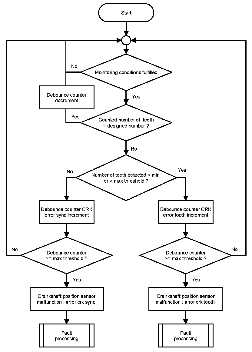 A teeth counter is incremented at every falling edge of the CRK sensor signal. If plus or minus one tooth is detected during the last 360° CRK at the reference gap, the tooth number debounce counter will be incremented. If the counter exceeds a limit, a CRK tooth error is delivered to the error management.