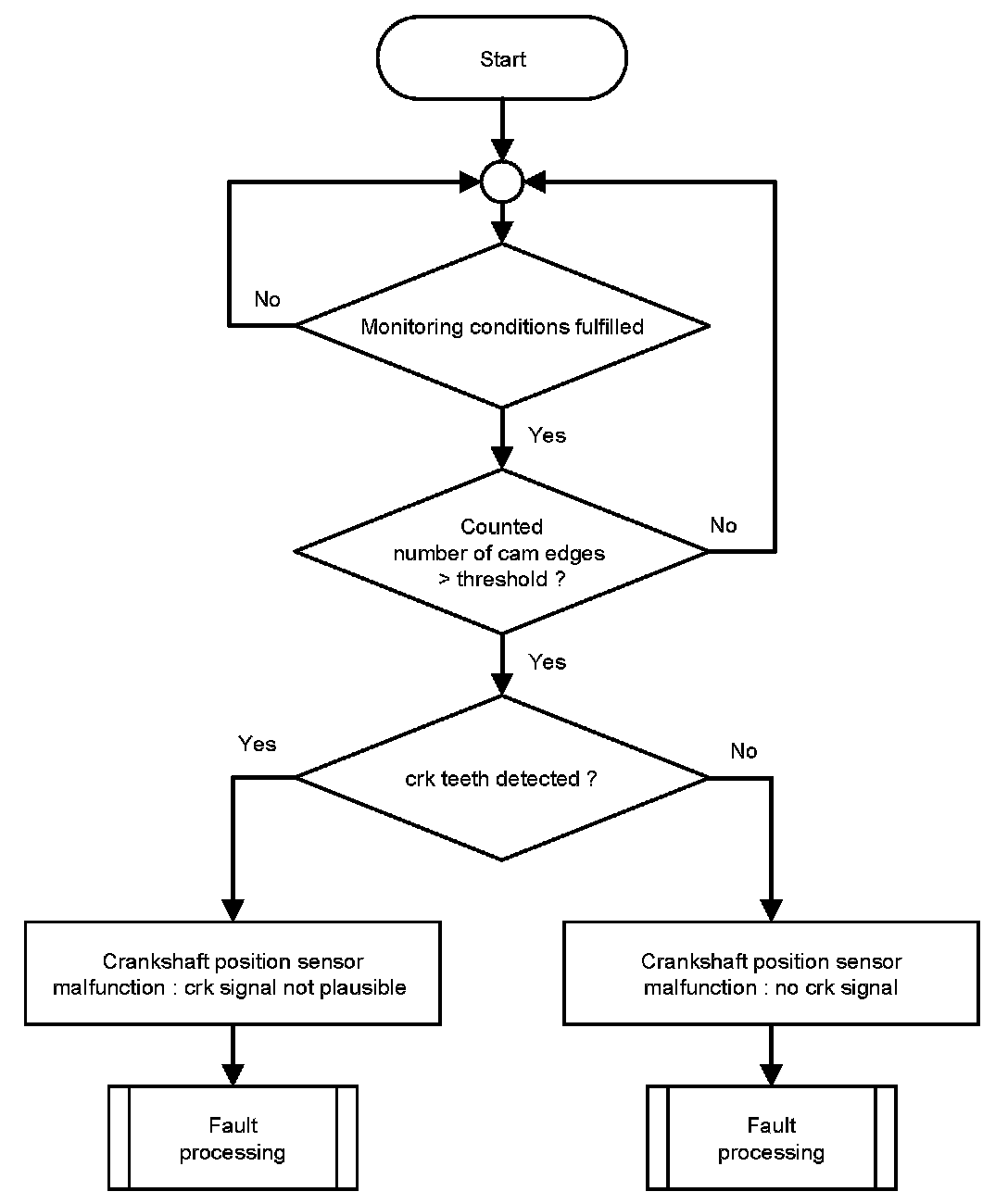 The monitor of implausible crankshaft signal is based on the detection of CAM signals without receiving correct CRK signal. If 9 or more CAM edges are detected (eg. 2 engine cycles), without valid synchronization of the crankshaft, then CRK plaus error is detected and delivered to the error management. If no CRK signal at all is received, the symptom is "missing signal", else the symptom is "implausible signal".