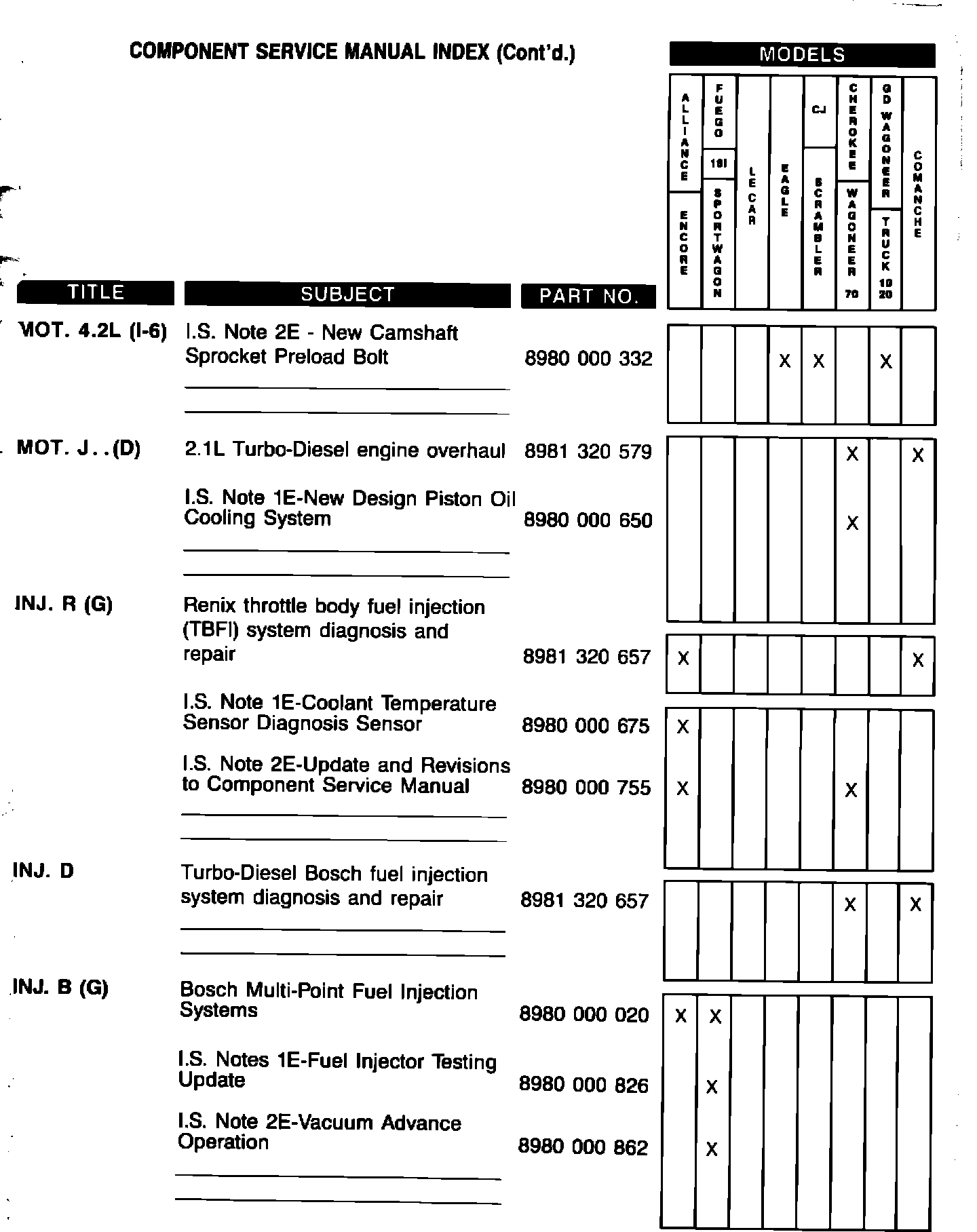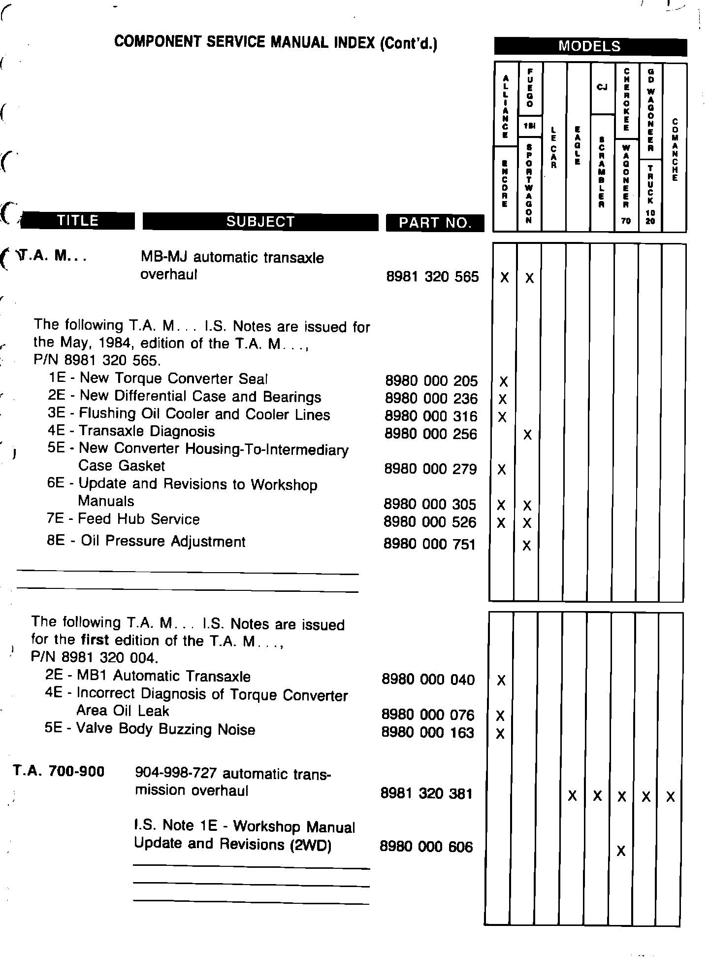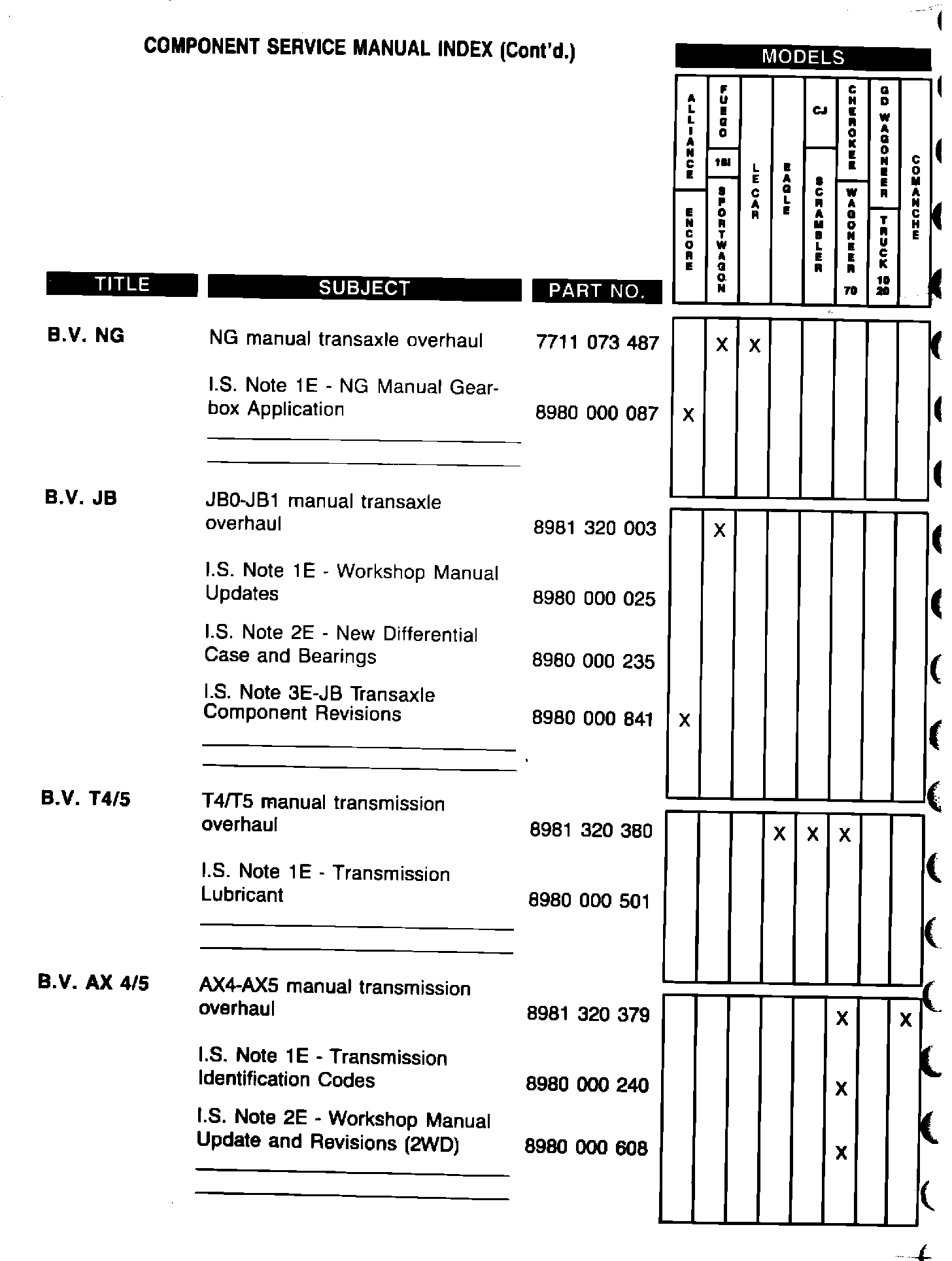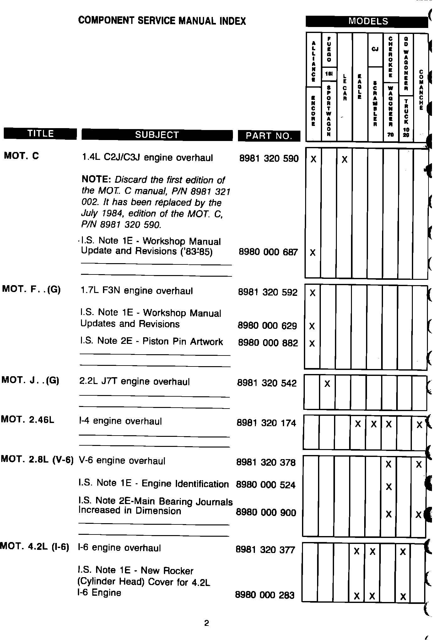 This index outlines the latest component service manuals and I.S. Notes issued to date. The manuals are listed according to subject matter, i.e., engines, gearboxes, etc. I.S. Notes issued for each component manual are listed in numerical sequence under the appropriate manual.
