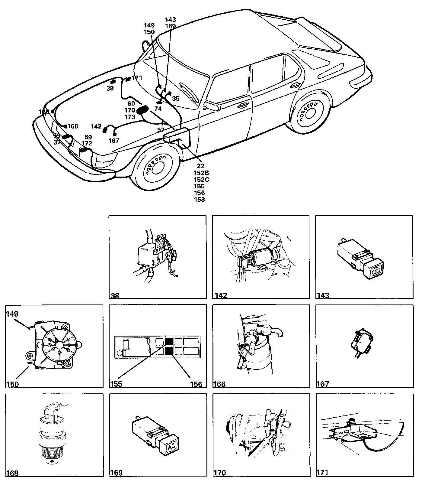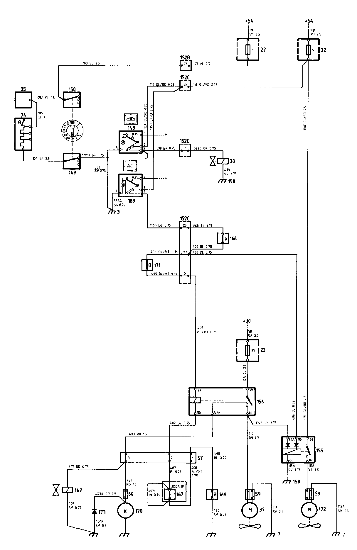 Extra radiator fan 172 for the AC is connected via relay 155 and is supplied from fuse 6.