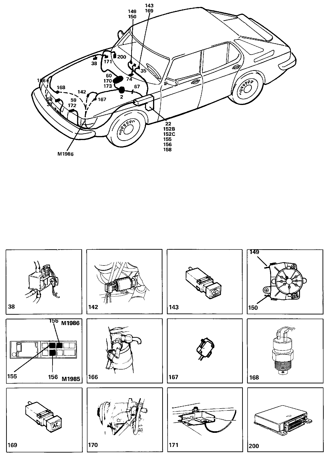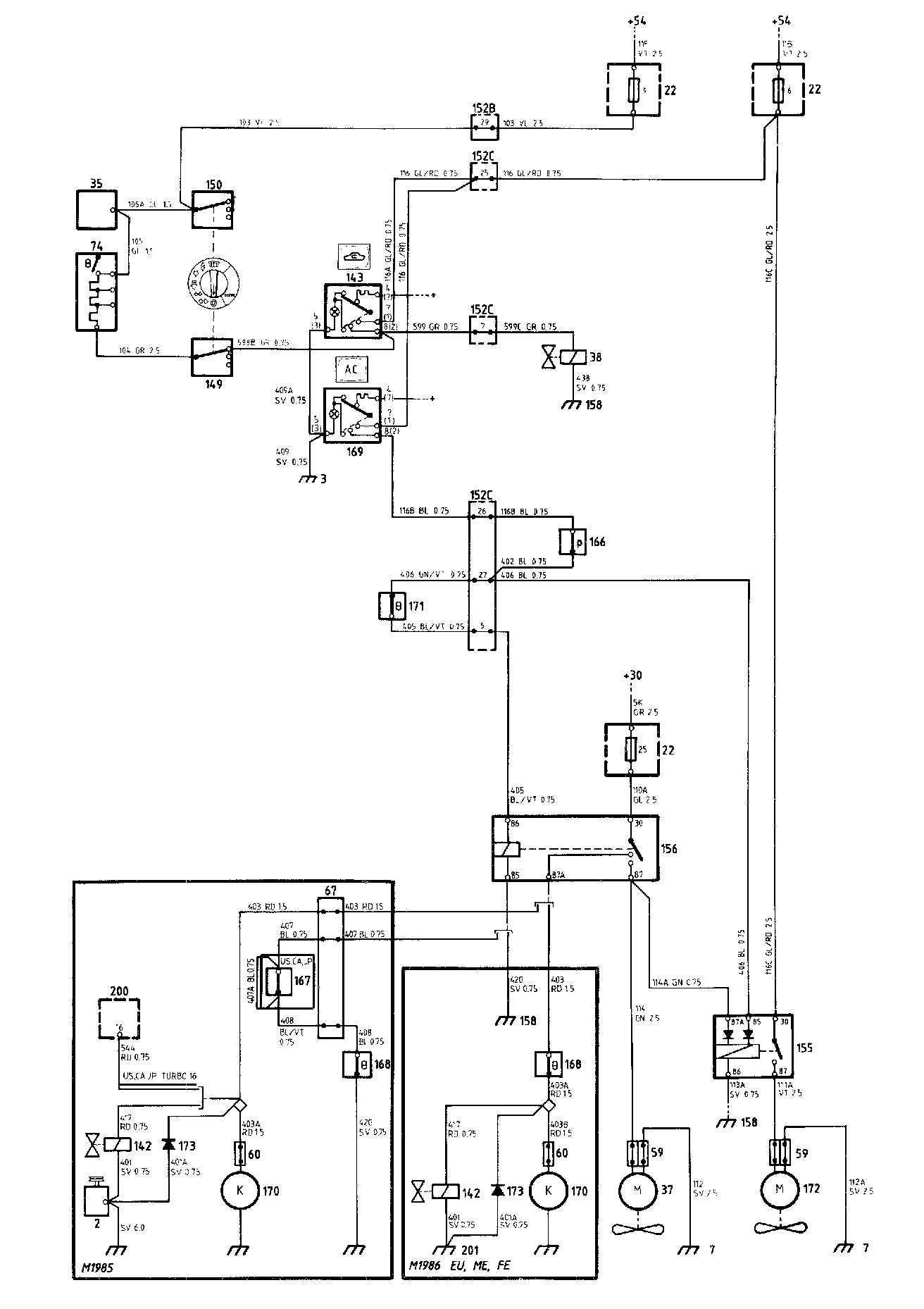 Extra radiator fan 172 for the AC is connected via relay 155 and is supplied from fuse 6.