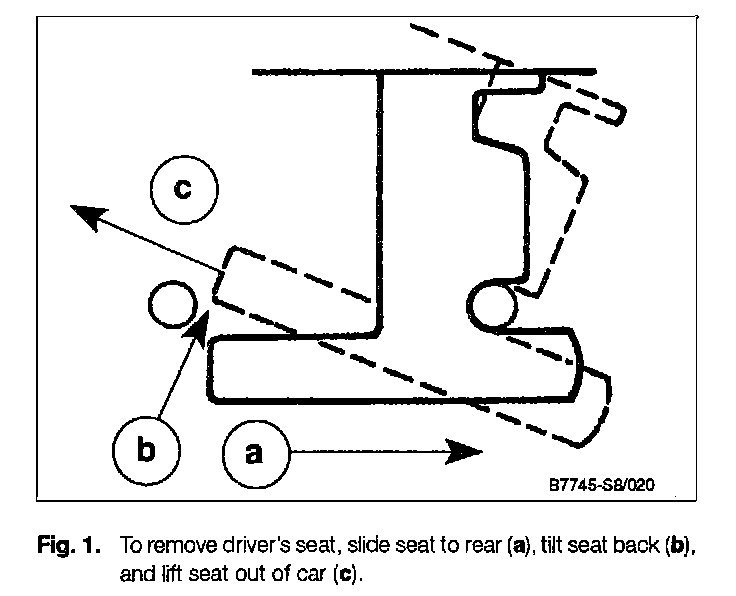 4. To remove the driver's seat, release the front catch by sliding the seat back to the limit of its travel. Tilt the seat back and then lift it upward and forward, removing it from the car. See Fig. 1