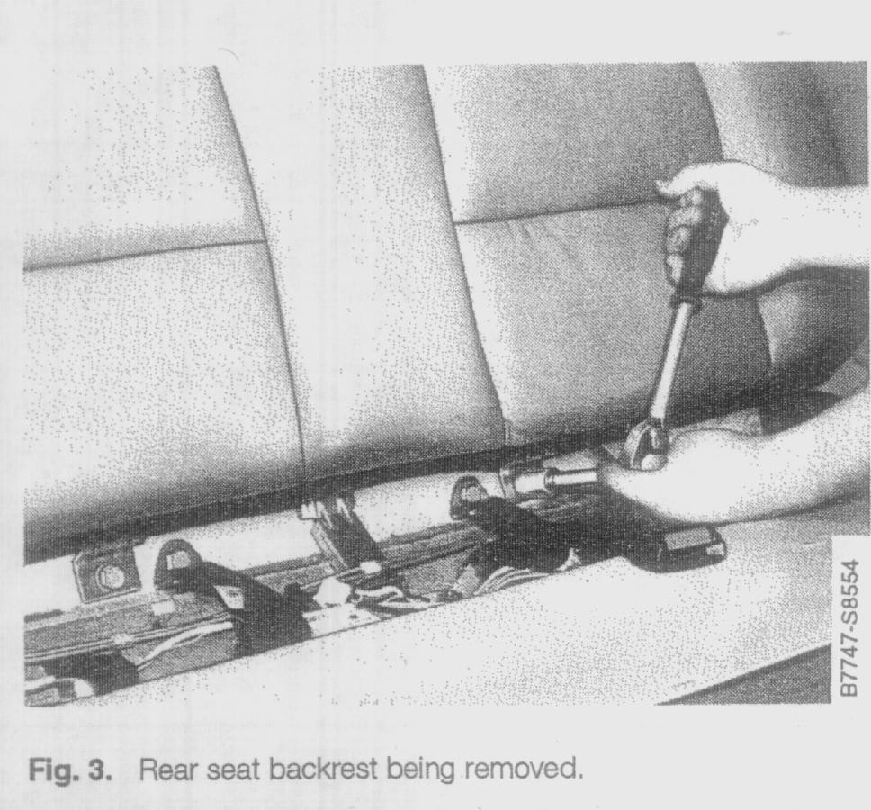 2. To remove the rear seat backrest, pivot the lover seat cushion up and into the cargo position. Release the rear seat back cushion and pivot it forward slightly. Then unbolt the hinges from the body. See fig. 3
