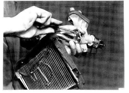9 Separate. the heat exchanger with water valve from the heater housing and guide it backwards and downwards. To make sure there is room for the water valve to pass between the heater housing and the steering column, unhook the brake pedal return spring and depress the pedal slightly.