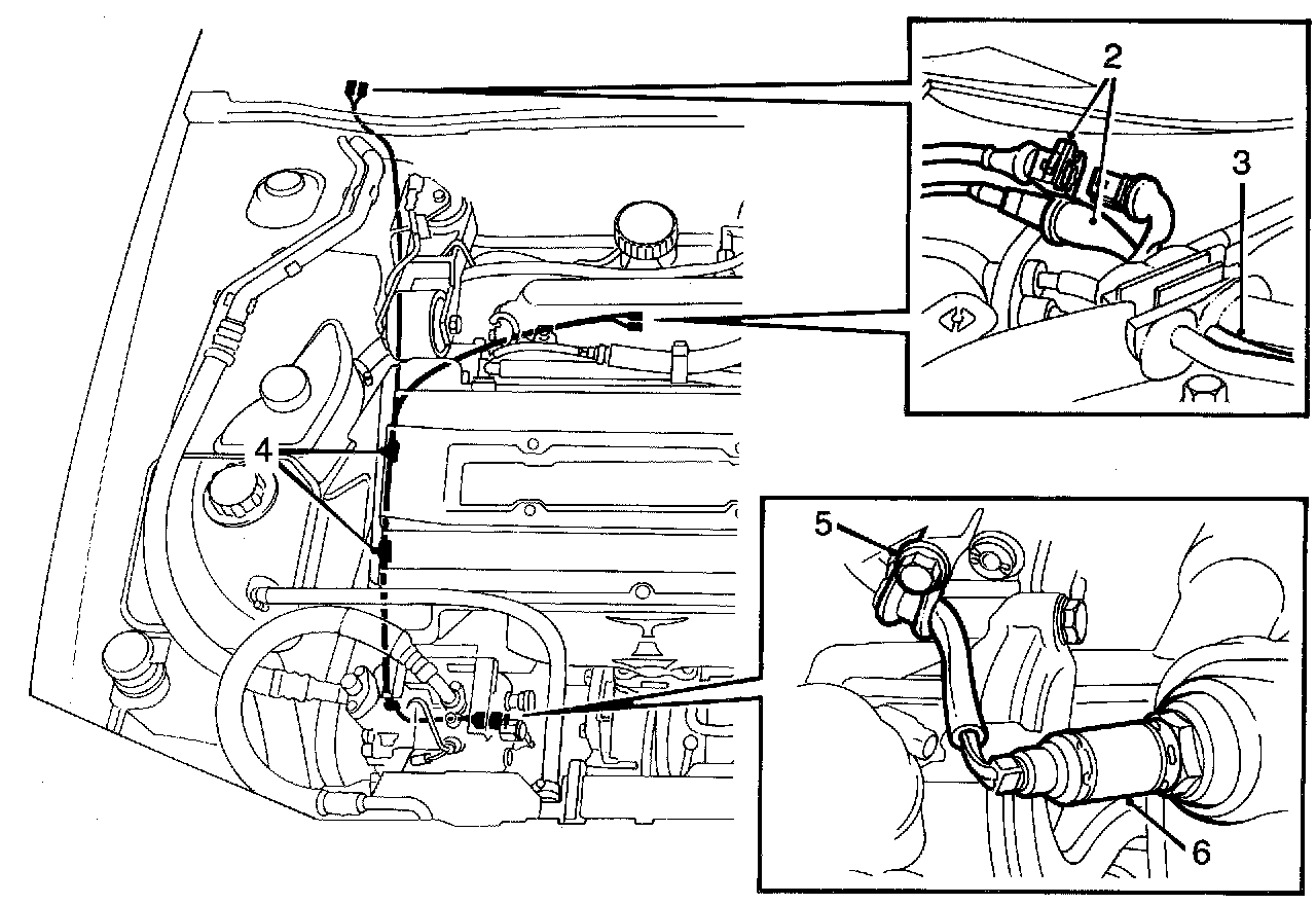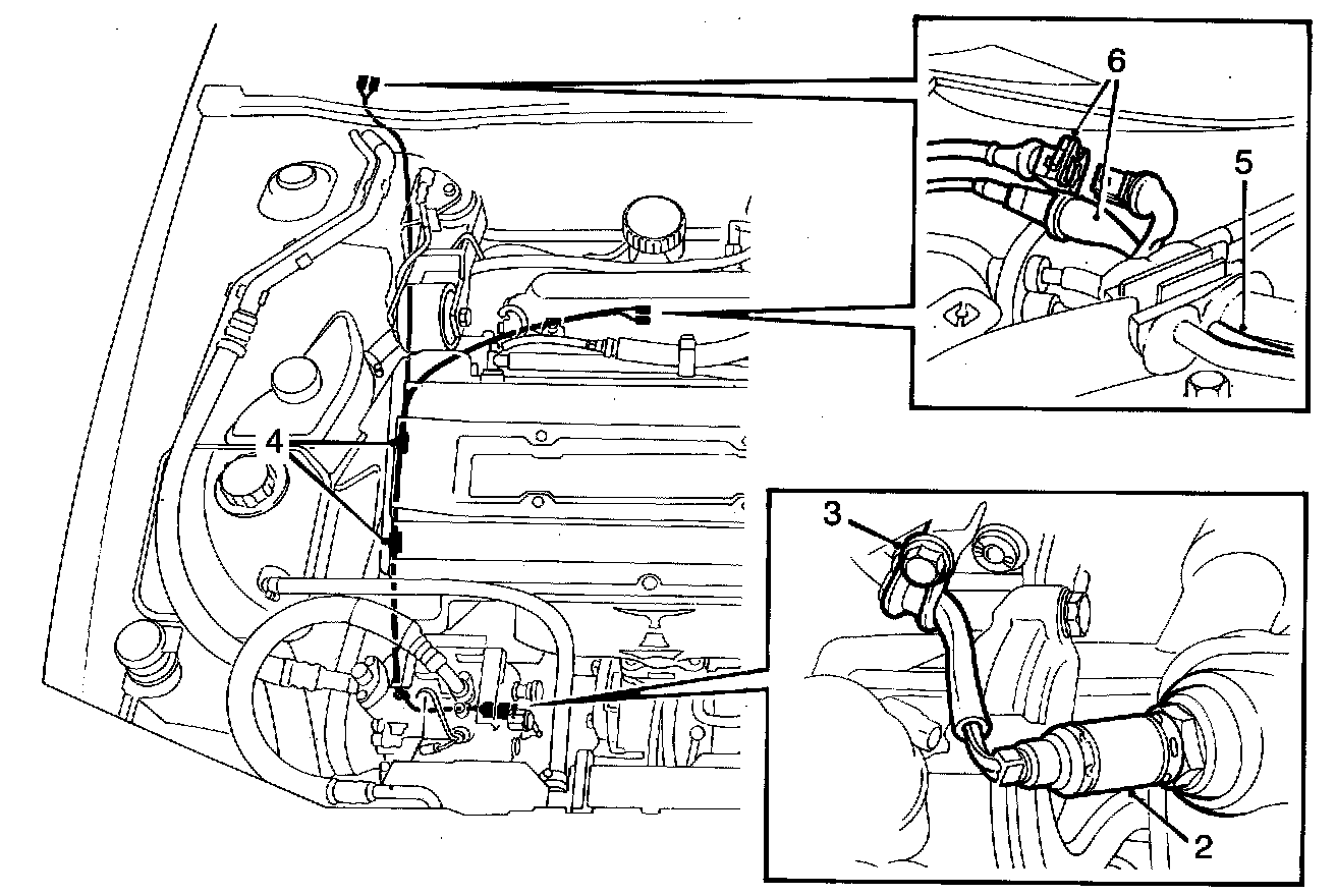 4 Remove the clamps securing the oxygen sensor 5 lead to the coolant pipe.