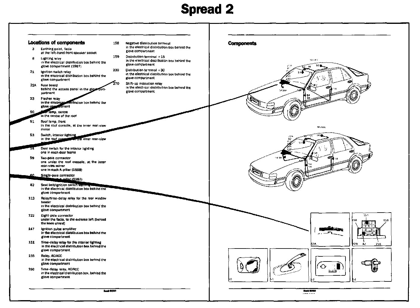 An example of two spreads for a sub-system - in this case the interior lighting with time delay - is shown below, together with explanations of the designations used, etc.Unless otherwise specified, switches are shown in un-actuated condition and relays in de-energized condition.
