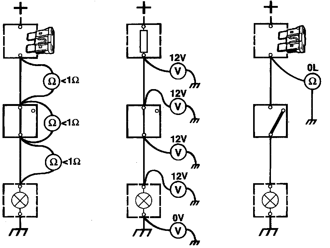 3 At the output of a control module or switch, take readings in the direction away from them and proceed successively towards the load. When the voltage reading drops to zero, you have just passed the break in the circuit.