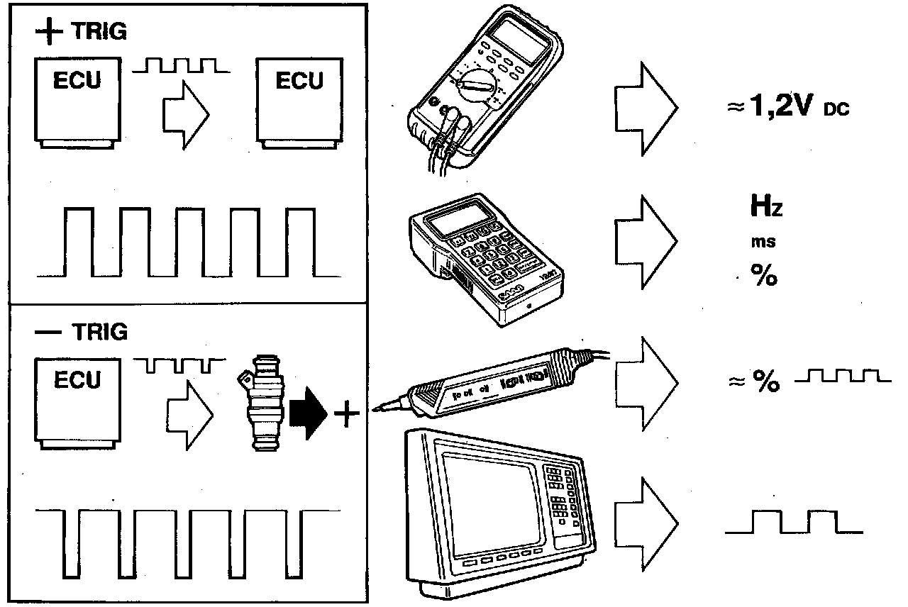 In the case of PWM triggered by a negative pulse, connect the black test lead to the cable and the red test lead to battery + (positive).
