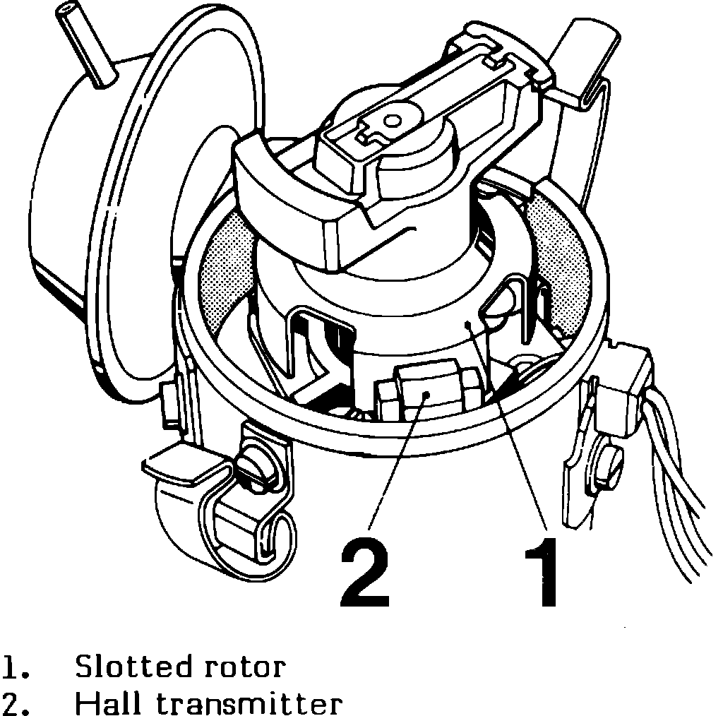 The distributor, Fig. 1, contains a slotted rotor mounted on the distributor shaft and a Hall effect switch mounted on a plate inside of the distributor. The distributor has both vacuum and mechanical advance mechanisms.