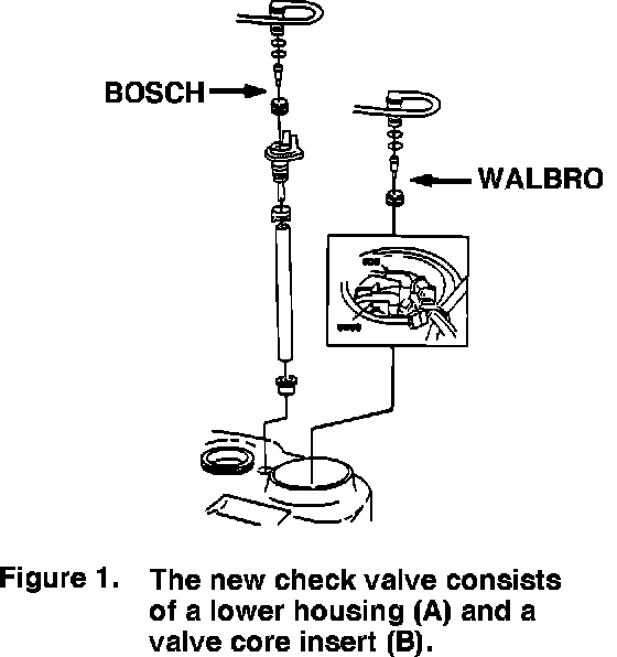 On vehicles with the fuel return line check valve integrated into the fuel line at the tank (Figure 1), it is possible for the rubber flap that acts as the check valve to become detached and block the return line or the ejector pump. A blocked or restricted fuel return line will cause driveability complaints due to excessive line pressure. This complaint can be diagnosed by measuring the fuel system pressure with a pressure gauge or the LH Tester. To prevent this, a revised check valve has been introduced into early-M89 production. The redesigned check valve consists of a new lower housing to the return line fitting and a valve core insert (Figure 2). This check valve may also be used to correct earlier cars.