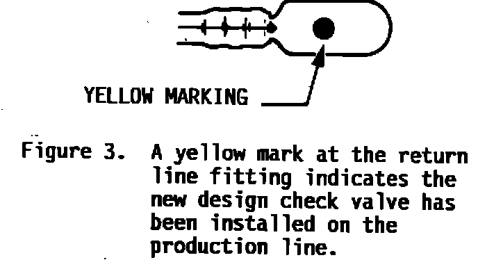 1. First inspect the return line in the car. If there is a yellow dot on top of the return line fitting (Figure 3), a new design check valve has already been installed on the production line. Check to see that it has been installed correctly (Figure 5). If so, driveability problems are not related to this S.I..