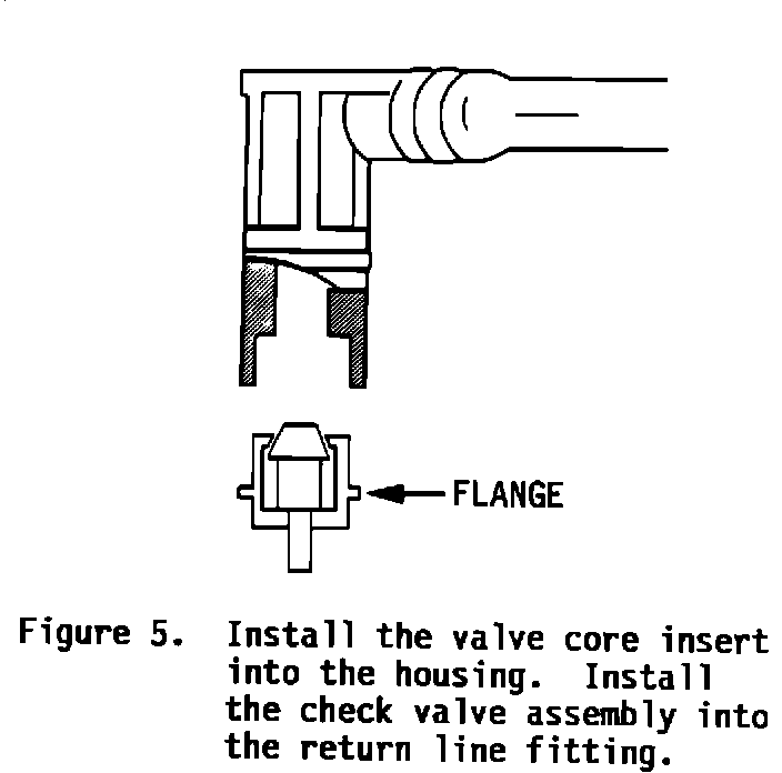 5. Insert the new check valve insert into the new check valve housing. Install this check valve assembly into the return line housing. (Figure 5). The collar of the new housing should engage the groove in the return line fitting when the flange is flush against the bottom of the fitting (Figure 5).
