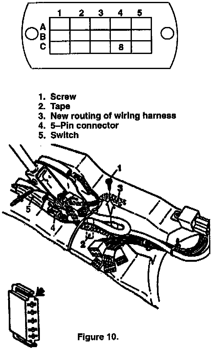 Secure the new wiring harness and the connector by fastening a tie strap at least 10 inches long (P/N 79 71 880 or equivalent) around the left branch of the air duct.