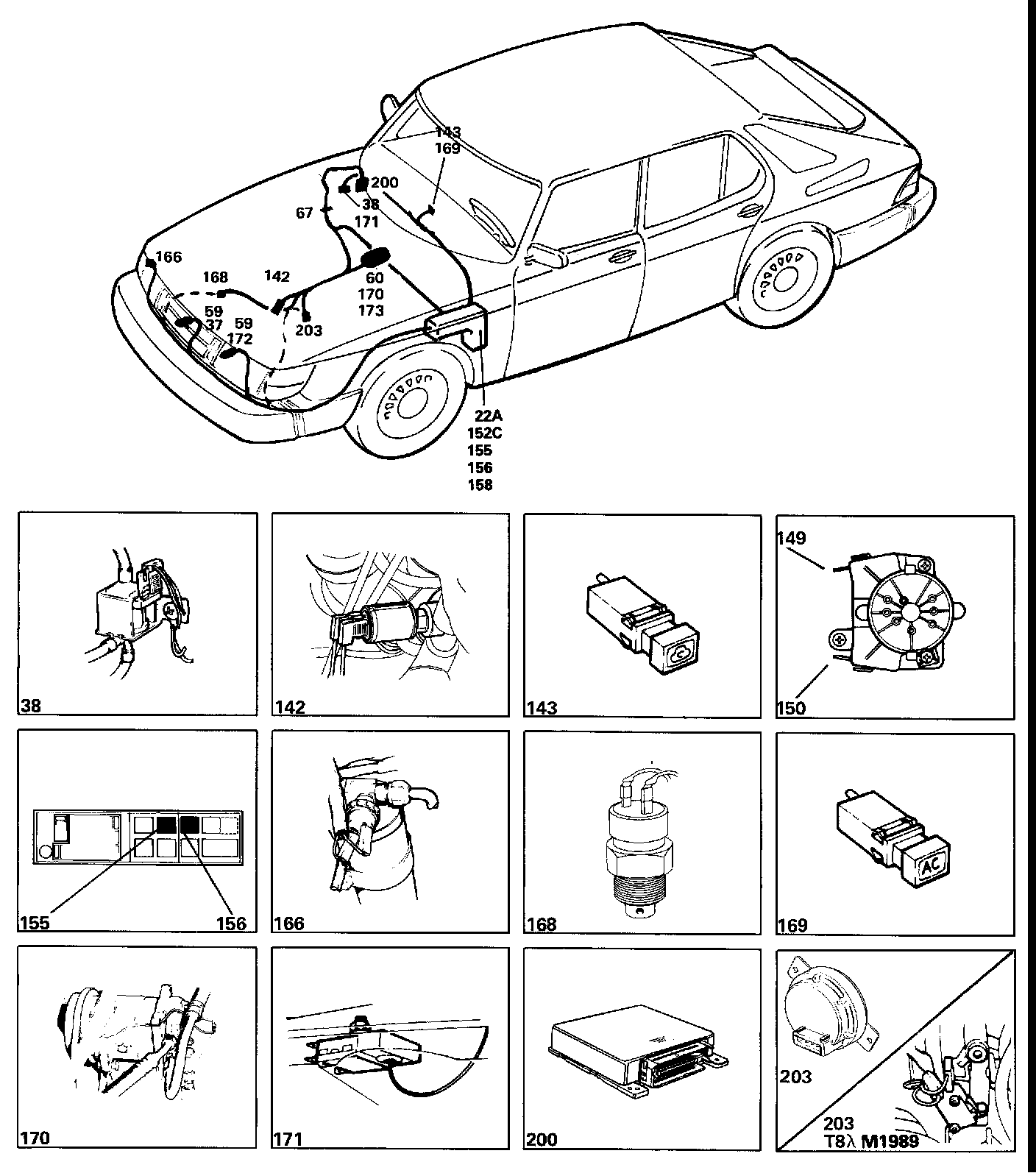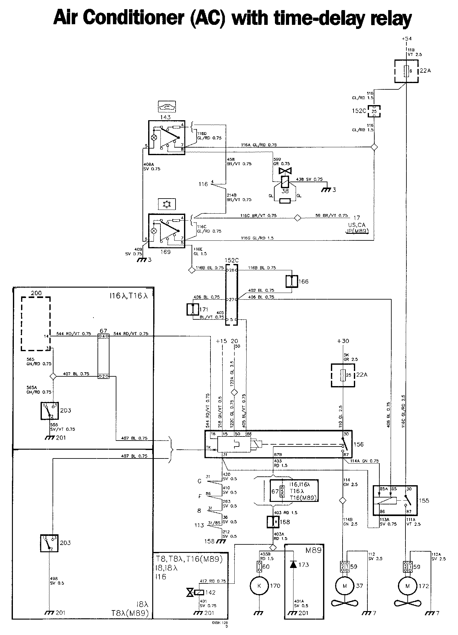 Relay 156 is equipped with two time delay functions. One of these is activated whenever the engine is started. Ignition switch 20 (in the start position) supplies pin 50, and if switch 169 is then depressed, the energizing of the relay and thus starting of the compressor will be delayed by about 10 - 20 seconds (depending on the engine variant), to ensure that combustion in the engine will be stable after starting, before the the AC load is applied.