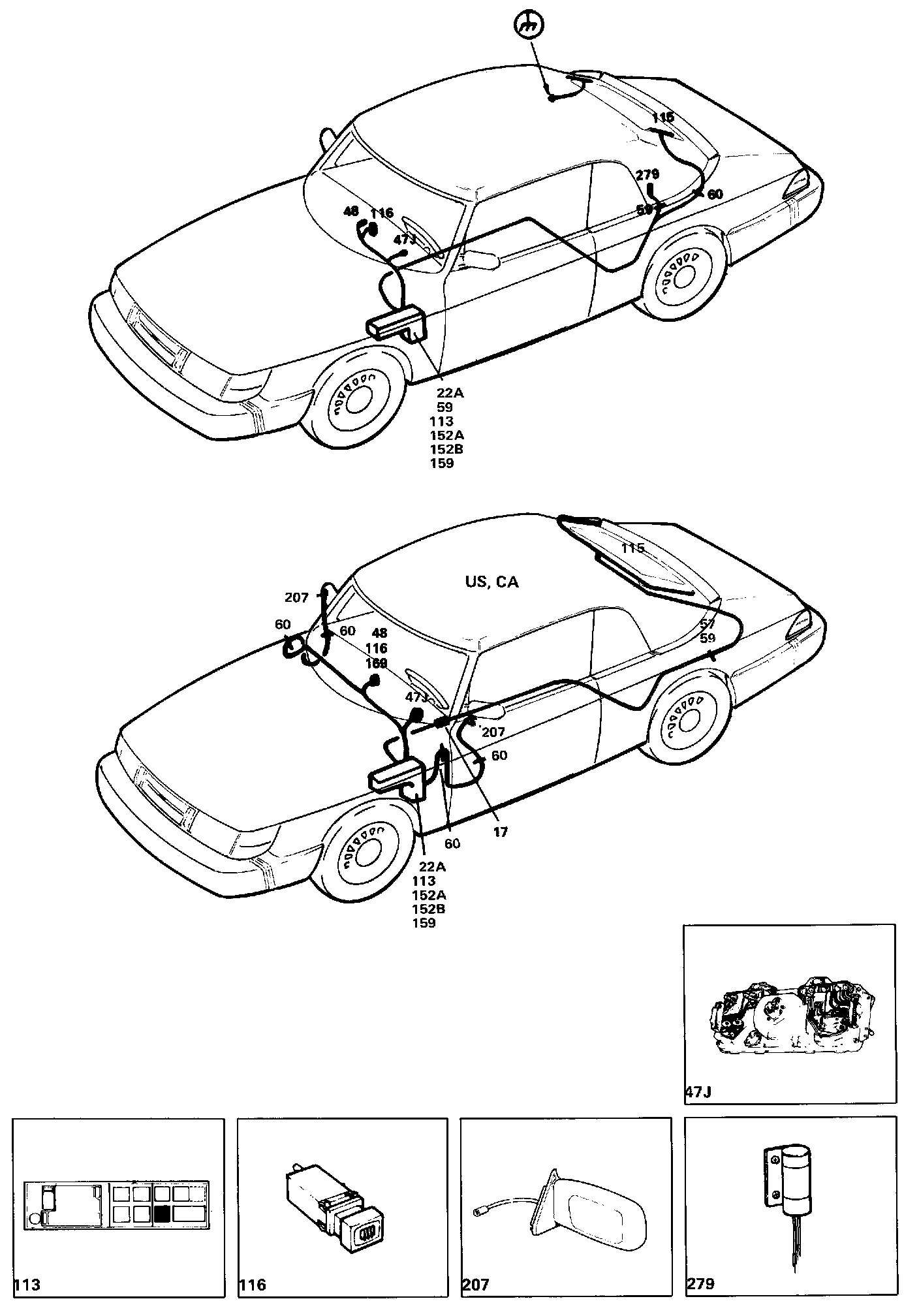 The electric heating of the rear window can be switched on and off by means of switch 116. (The switch is spring-loaded and is combined with a time- delay relay.) For a complete description of the wiring for the lighting of the switch on cars for the US and CA markets and 1989 model for JP, see also the section entitled "Lighting systems, Lighting for controls - US, CA and 1989forJP".