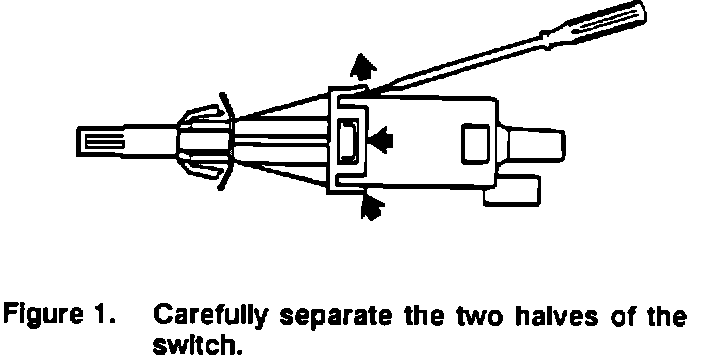 4. Carefully separate the two halves of the switch using small screwdrivers to release the four catches (see Figure 1). Do not use excessive force when releasing the tabs or they may break. As an aid, a feeler gauge blade may be inserted under the tab so it will remain released after the screwdriver is removed.