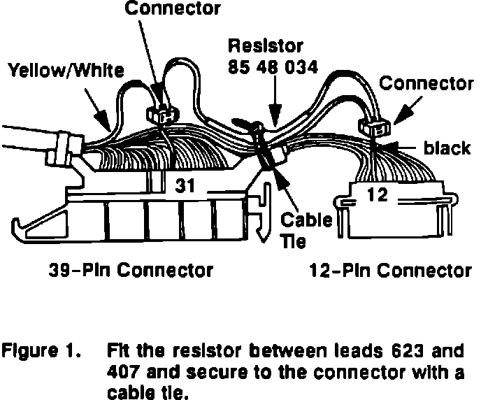 2. Fit resistor, 85 48 034 between lead 623 (black) from the 12-pin connector on the ACC control unit and lead 407 (yellow/white) from the 39-pin connector on the ACC control unit.
