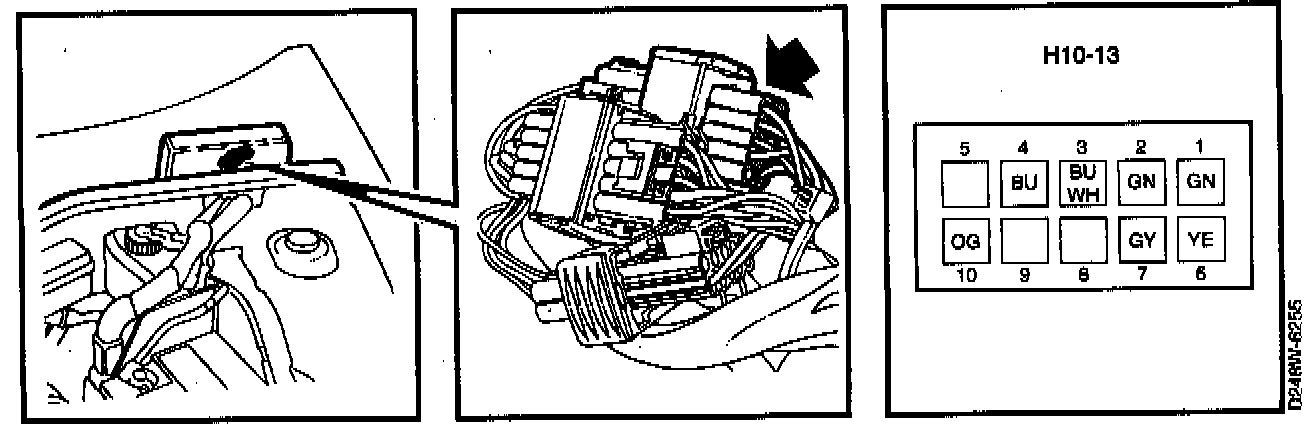 10-pin connector in engine bay on left adjacent to windscreen wiper motor, H10-13: