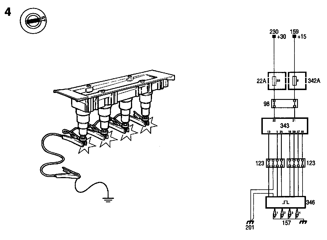 - Connect test lamp 86 11 857 to pins 6 and 10 of the ignition discharge module connector or to pins 3 (black) and 4 (grey/red) of connector 123/H4-10.