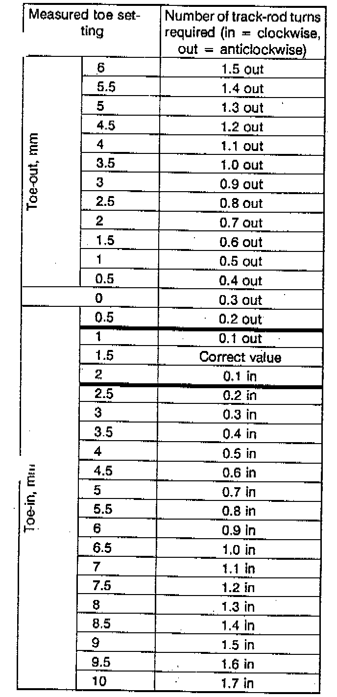 2. Find this value in the toe-out section of the first column and follow the line across to the second column, that gives the number of required turns: "0.5 out". This means that together the two track rods must be rotated 0.5 turns, that is to say each track rod should be rotated 0.5 turns outwards or counterclockwise.