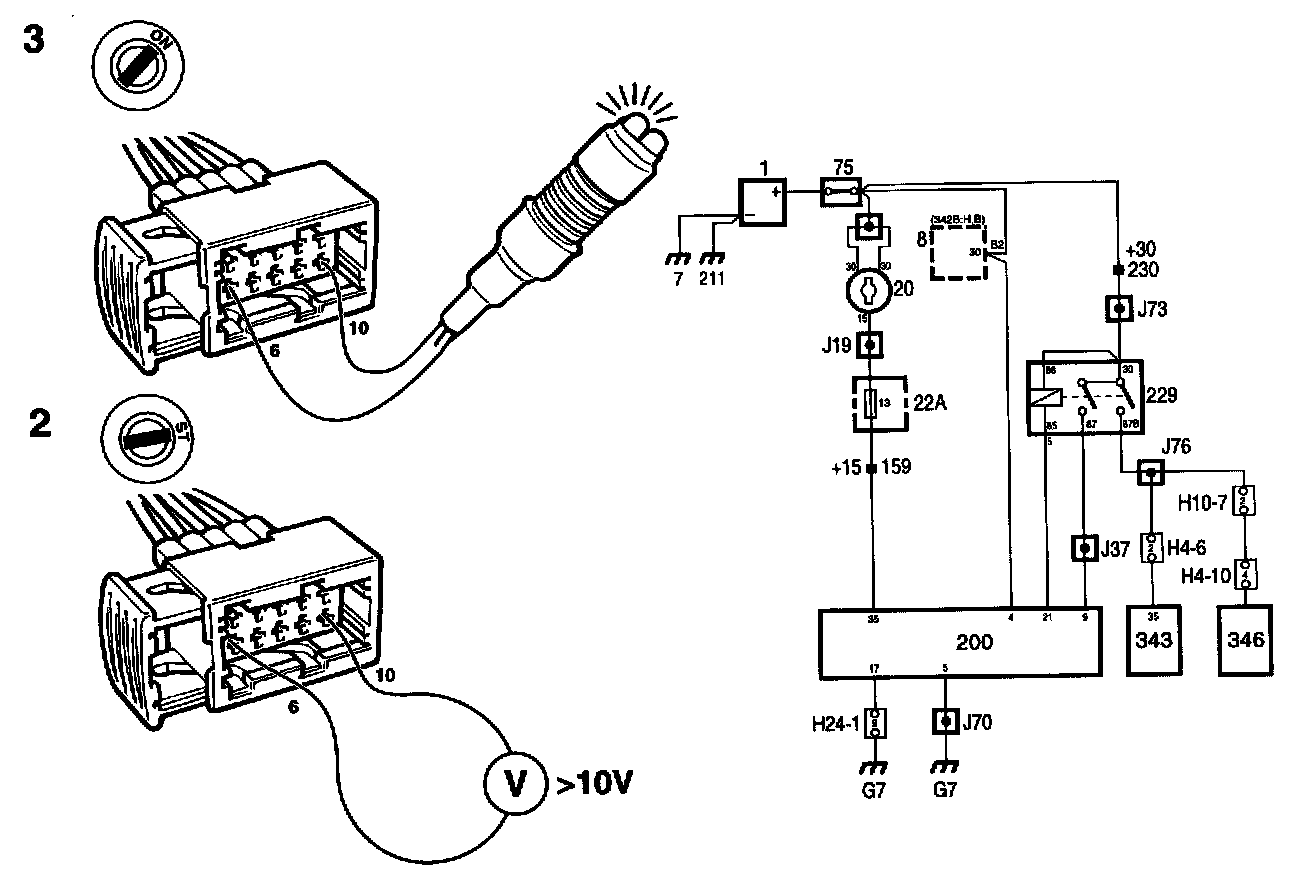 - Check the power supply in connector 123/H4-10, pin 4, or in the ignition discharge module, pin 10.