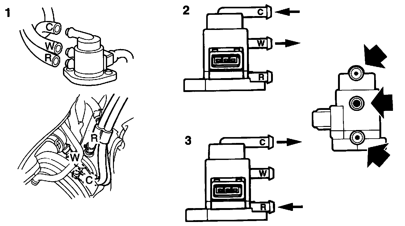 3 Blow through the return hose from the intake manifold (R) and check that air comes out of the hose for the turbocharger (C).