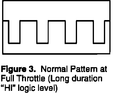 ^ As you increase the throttle opening, you should see an increase in the duration of the "HI" logic signal (the red LED becomes brighter and the green one goes dimmer). The change will be much more dramatic if you place the engine under load. Stall test an automatic or let out the clutch in gear with the brakes on in a manual transmission car. (See Figure 3.)