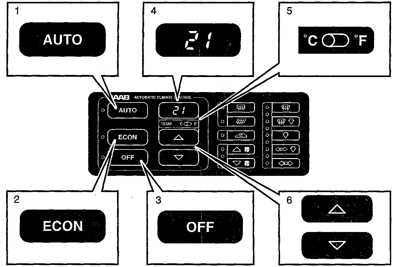 The display shows the selected temperature in the cabin. The display shows "HI" if the selected temperature is above +27 °C (81 °F) or "LO" if the selected temperature is below +17 °C (63 °F).