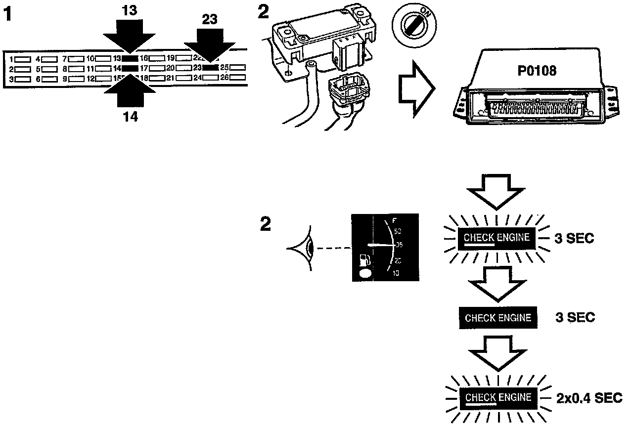Diagnostic trouble code readouts with lamp flash codes. In the DTC table it can be seen that diagnostic trouble code P0108 is denoted by 2 lamp flashes. Engine Control Systems