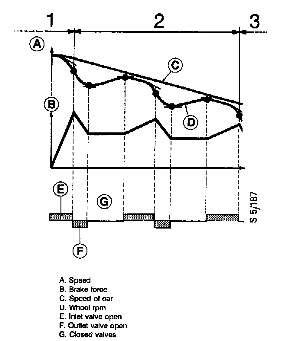 The signals from the wheel sensors are processed by the ECU, which computes a reference speed for the vehicle. The individual signals are then compared with this reference speed. If any of the signals depart from this reference value, the modulating procedure will be activated, as follows: