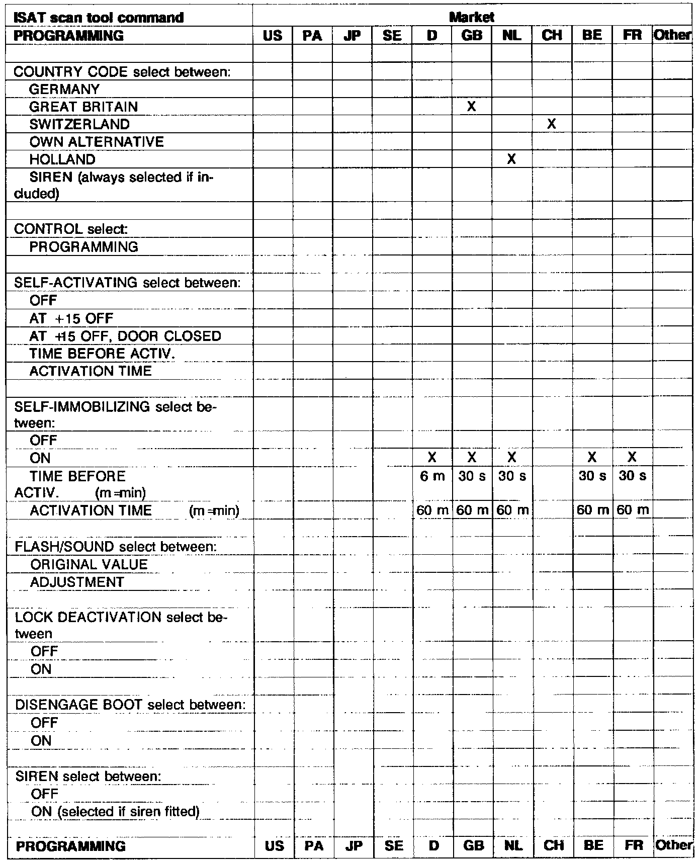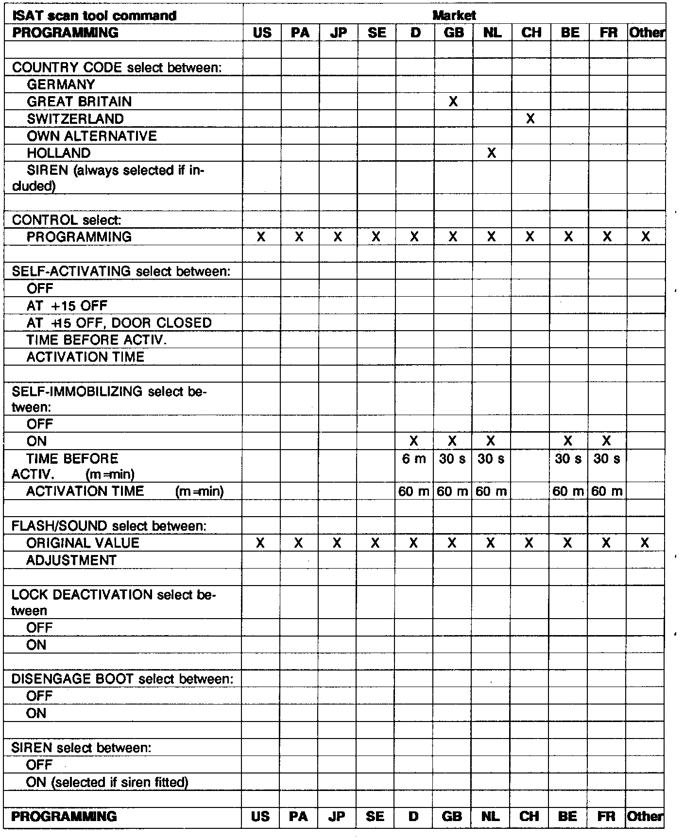 The theft alarm control module has a basic program from the supplier. EOL programming is then carried out in the factory. This cannot however meet the requirements of all countries which means that further programming must be done at delivery service, see the table on the next page. When changing a control module, the alarm must be programmed as spare part programming, see the table below.