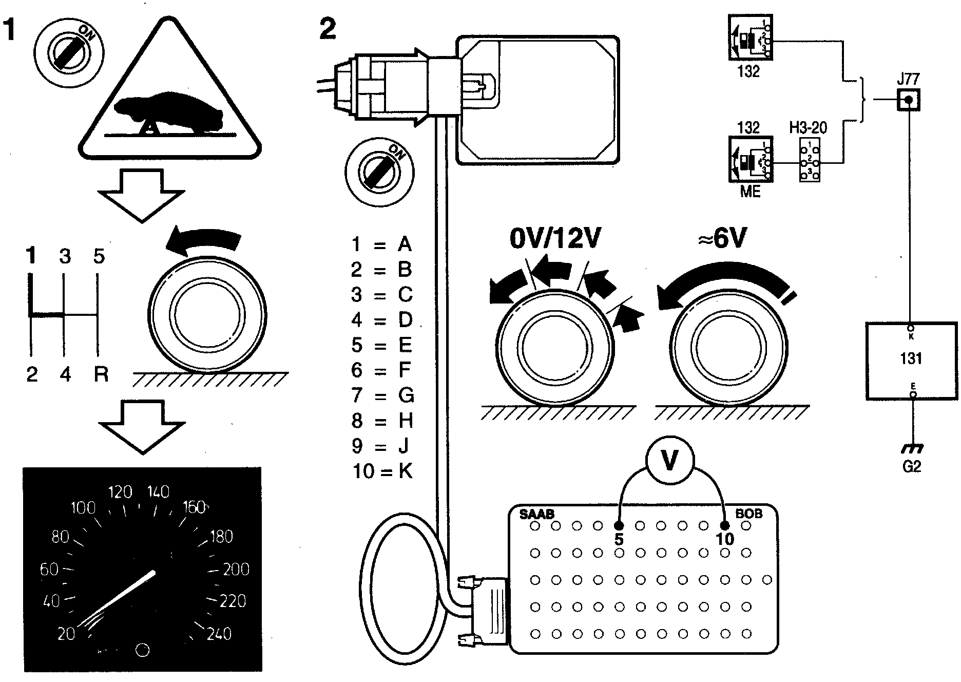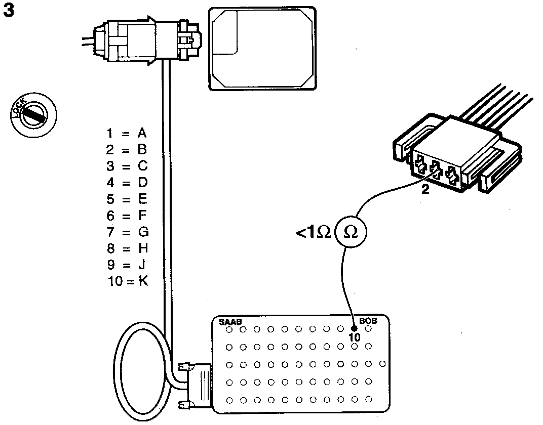 2 Connect a BOB to the Cruise Control system control module and measure the speed pulses on pin K (10) with the engine running and the front (driven) wheels either rotating or stationary.