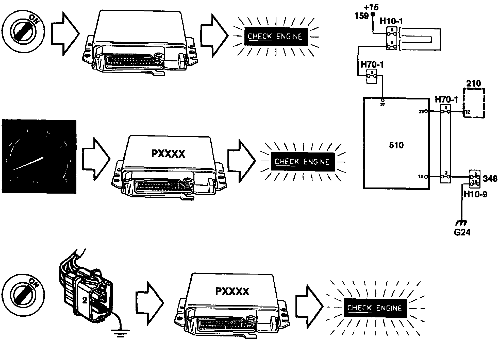 If an emission-related fault arises, the CHECK ENGINE lamp (MIL) will light up. The diagnostic trouble code can then be obtained with an ISAT Scan Tool or with flash codes by grounding pin 2 in the data link connector.