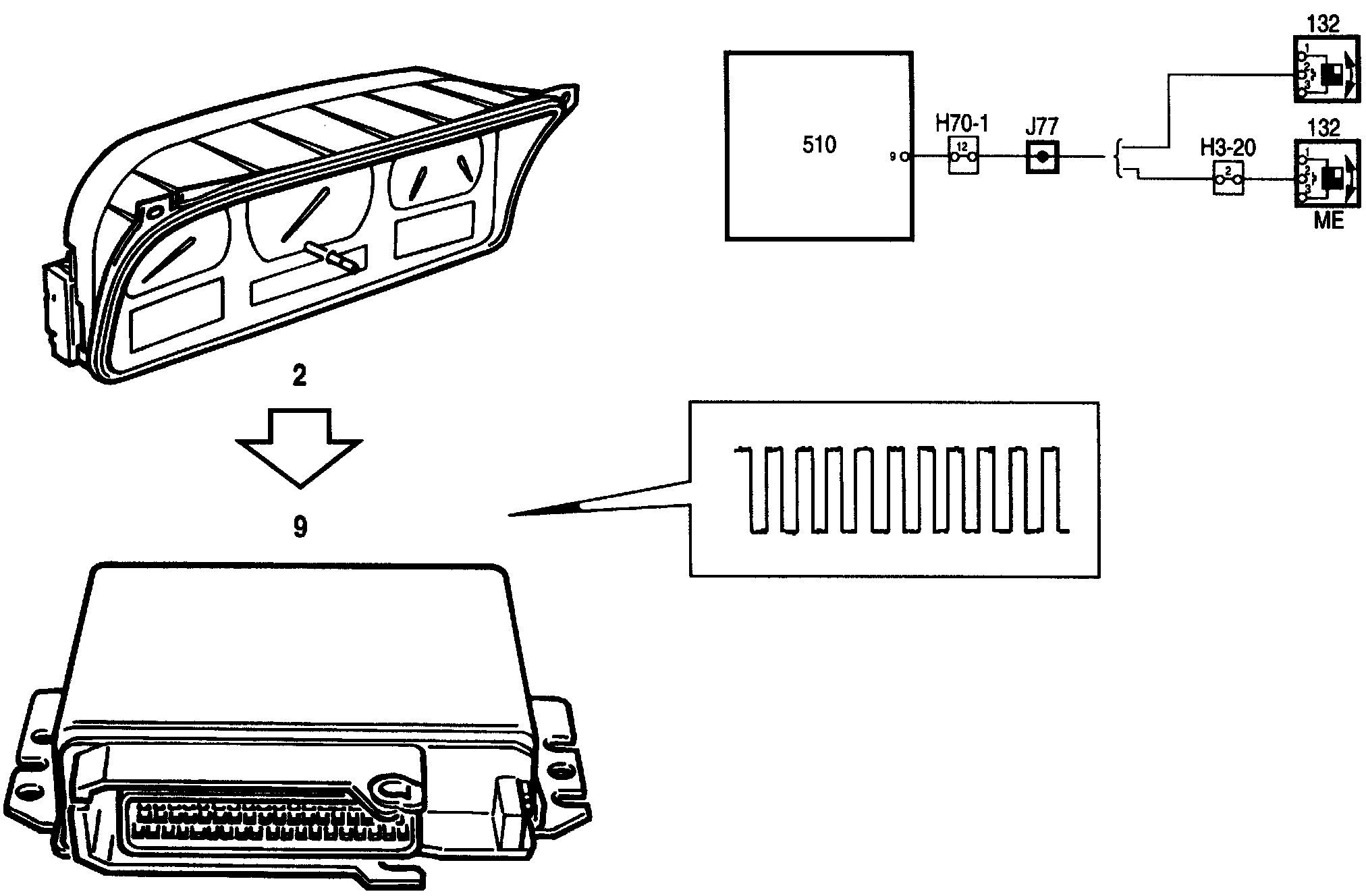The speedometer sends a speed signal to pin 9 of the Motronic control module. This signal is a square wave which varies between 0 V and battery positive voltage. At 30 km/h its frequency is about 20 Hz.